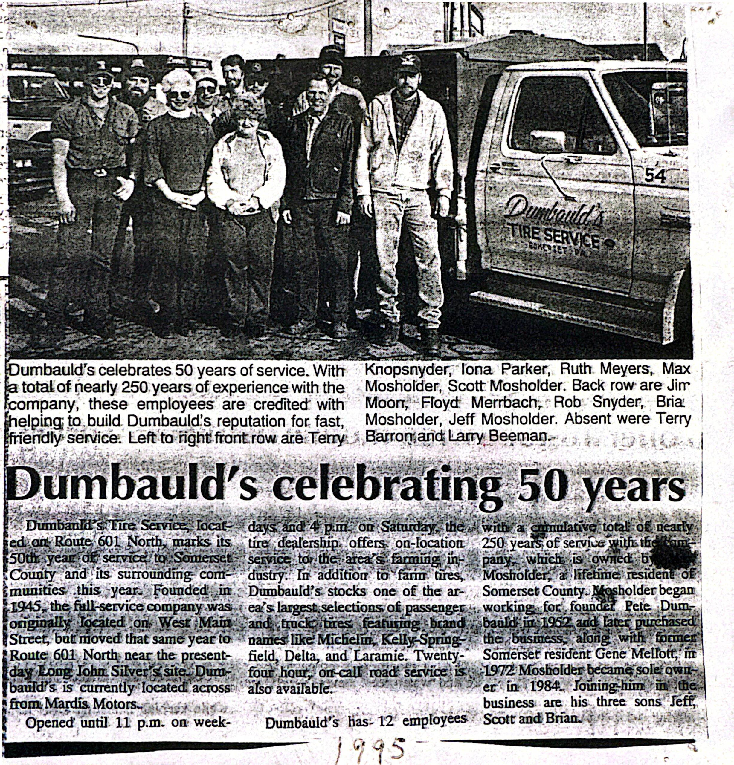 A defining chapter in the company’s history began when Max Mosholder joined the business as a high school senior in 1952. Over time he learned the trade and eventually became the owner, operating Dumbauld’s Tire Service for decades. Known throughout Somerset for his strong work ethic and friendly personality, Max helped grow the shop into a trusted local business while building lasting relationships with customers.