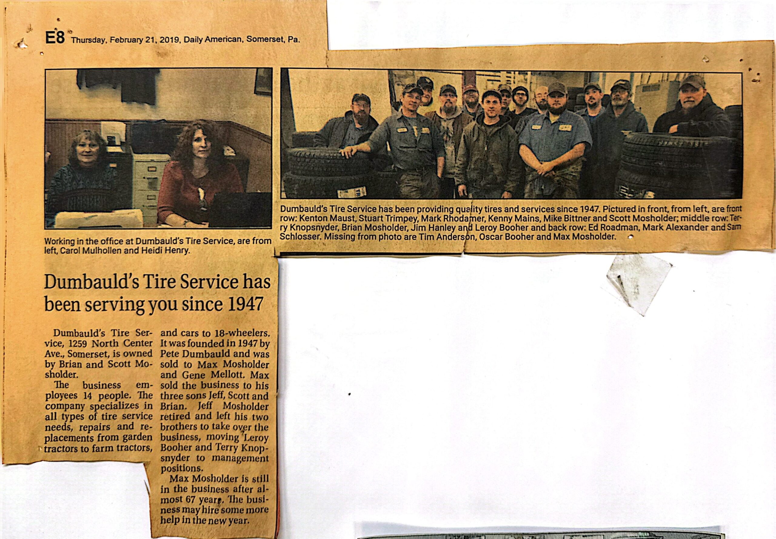 Through the years, the Mosholder family has proudly carried on the tradition of dependable service and honest work that built the company. Max passed the business on to his three sons, Jeff, Scott, and Brian, whose dedication and commitment helped continue the legacy he started. With the same focus on quality workmanship and excellent customer service, they have helped Dumbauld’s Tire Service remain a trusted family-run business serving Somerset and the surrounding communities for generations.